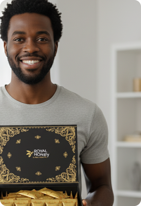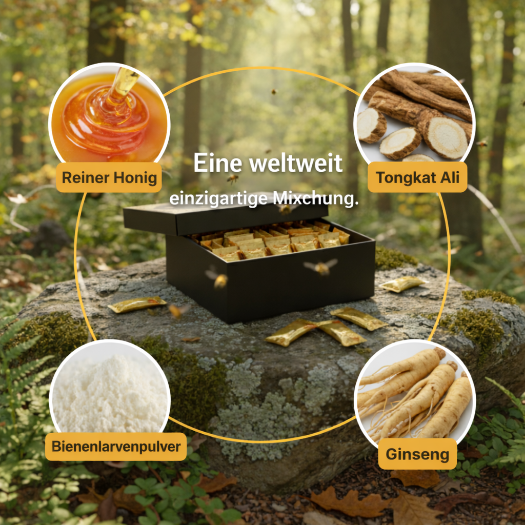 Royal Honey ist reiner Honig (97%) mit 100% natürlichen Inhaltsstoffen (z. B. Eurycoma, Panax Ginseng, L-Arginin, Gelée Royale), die sorgfältig ausgewählt und allgemein als sicher angesehen werden — ohne chemische oder labortechnische Behandlungen. Es ist darauf ausgelegt, Energie, Vitalität, Libido und körperliche Ausdauer zu unterstützen. Es ist kein Medikament.